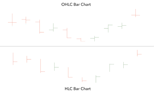 An OHLC bar chart shows open, high, low, and close prices, while an HLC bar chart shows only high, low, and close prices.